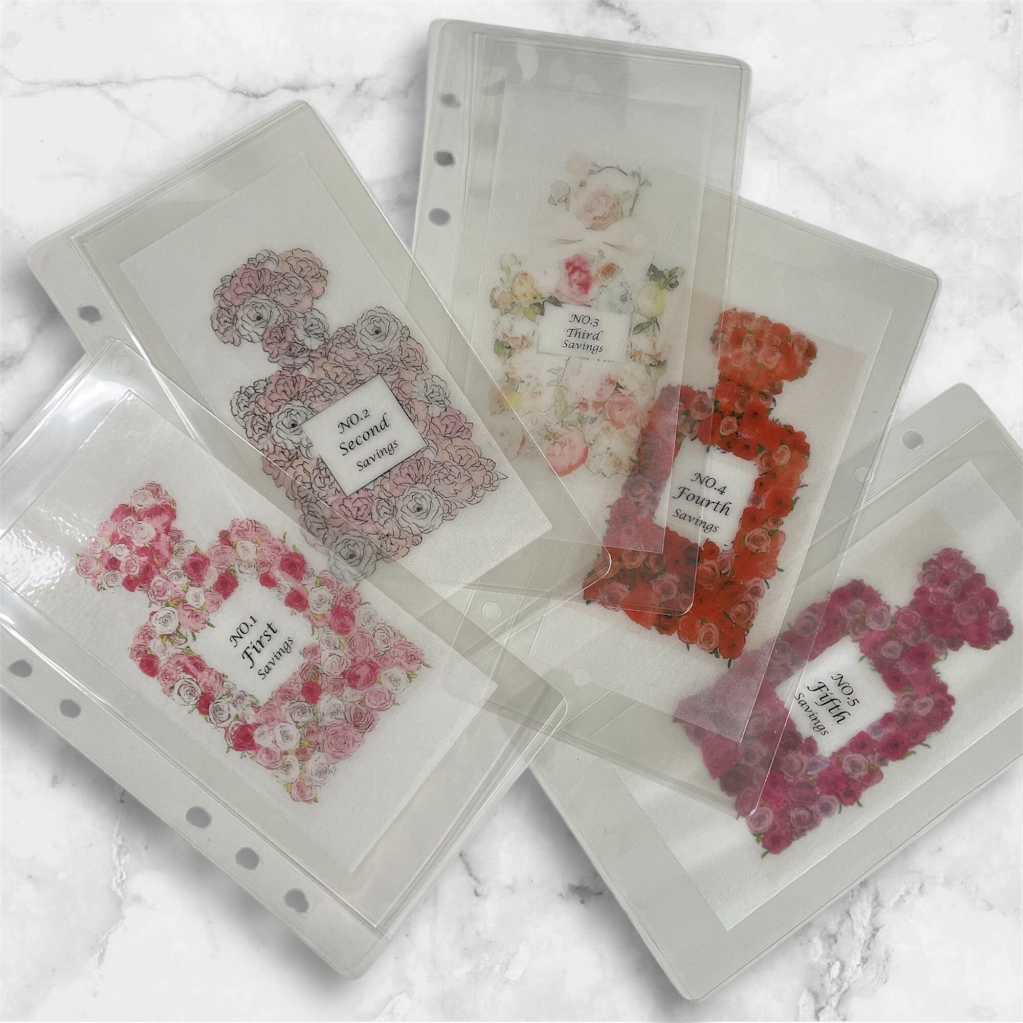 リフィルは5枚のセットで、それぞれ異なる香水ボトルをイメージしたデザインが施されています。日々の予算管理が楽しくなること間違いなしです。コンパクトなサイズなので、バインダーにもすっきり収納できます!
